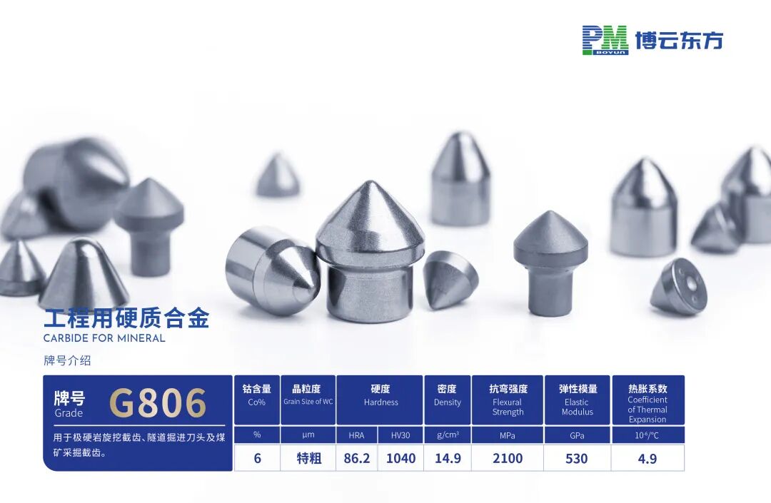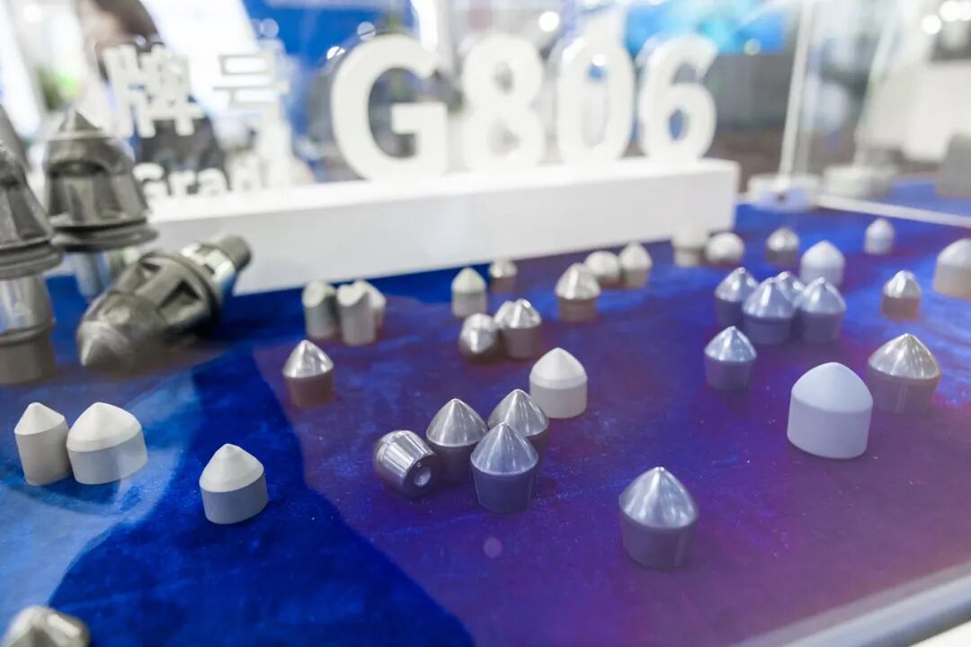 此次展會(huì),博云東方重點(diǎn)展示一款旋挖鉆機(jī)上的核心部件,它被譽(yù)為旋挖鉆機(jī)上的“鐵齒鋼牙”,牌號(hào)是G806特粗晶硬質(zhì)合金截齒。大家都知道旋挖鉆的功能,在青藏鐵路修建過程中,旋挖鉆機(jī)在惡劣的自然環(huán)境和復(fù)雜的地質(zhì)條件下完成了許多極為艱巨的樁基工程,旋挖鉆進(jìn)工法得以迅速興起,并已成為我國基礎(chǔ)孔灌注樁的首要施工工法,面對(duì)堅(jiān)硬巖層的樁基施工。硬質(zhì)合金截齒在循環(huán)沖擊及研磨下表面萌生疲勞熱裂紋并擴(kuò)展,造成合金崩塊導(dǎo)致截齒快速失效,而特粗晶硬質(zhì)合金截齒因WC晶粒粗大,Co相平均自由程大,能有效抑制疲勞熱裂紋擴(kuò)展,提高截齒的耐磨性,有效保持截齒刀頭的入巖角度,提高鉆進(jìn)工效。