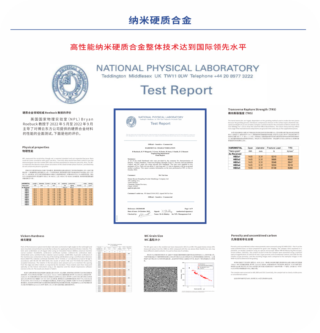 在此項(xiàng)獎(jiǎng)項(xiàng)公布之前,經(jīng)國際權(quán)威機(jī)構(gòu)英國國家物理實(shí)驗(yàn)室檢測,博云東方高性能納米硬質(zhì)合金的碳化鎢平均晶粒尺寸僅為0.11微米,硬度可達(dá)到2060HV30,抗彎強(qiáng)度達(dá)到5710兆帕,性能指標(biāo)處于國際領(lǐng)先水平。